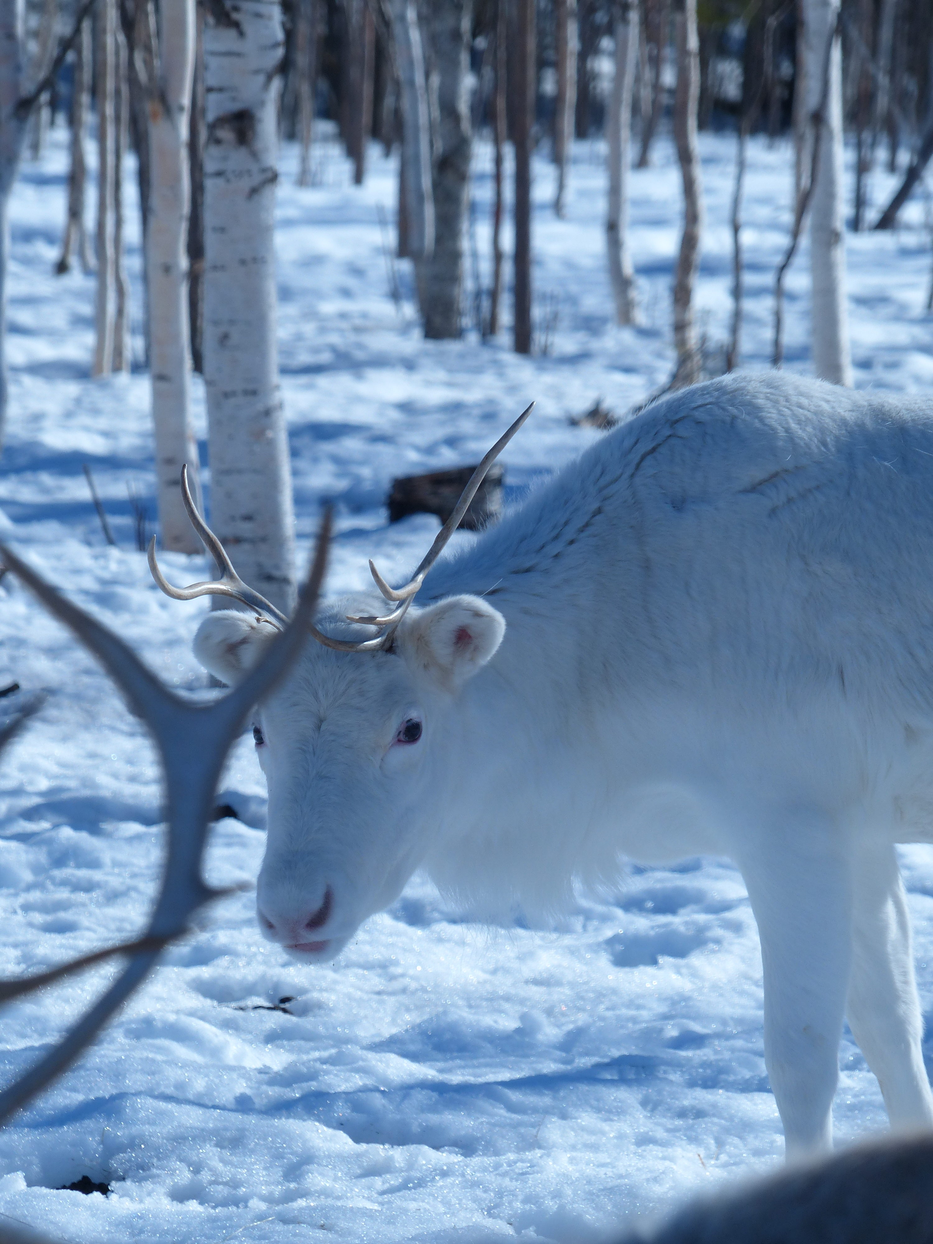 Snow White is a beautiful white reindeer doe, following in the footsteps of her mother, who also had a pure white coat and was exceptionally trusting of people. Snow White learned to trust humans by observing and mimicking her mother’s example.